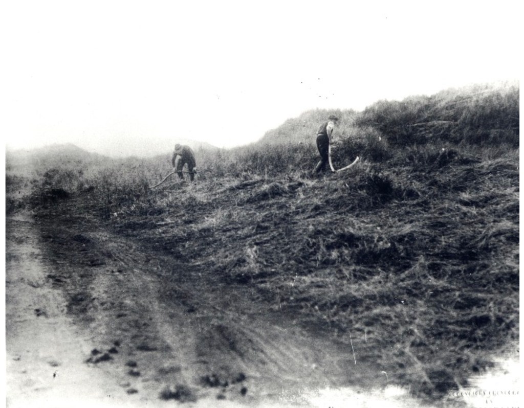 The construction committee first met on the 4th November 1926. Its initial task was to “Wire Hearn to instruct him to take up his duties on the following Monday morning”. Construction work started immediately, with six men at the outset. Six more were taken on 10 within a few days and others were to be employed as and when required. The wages were 9d (3.75p) an hour for the men and 25 shillings (£1.25) a week for youngsters. An order was placed with HTP Ltd of Truro for six hooks and hone-stones, three barrows, three buckets, two forks, two rakes and two turf-cutters, and Mr Healey was asked to construct a wooden tool-house. It was to be 12 ft x 10 ft and to be so constructed as to serve as a shelter on the course when no longer needed for construction work.