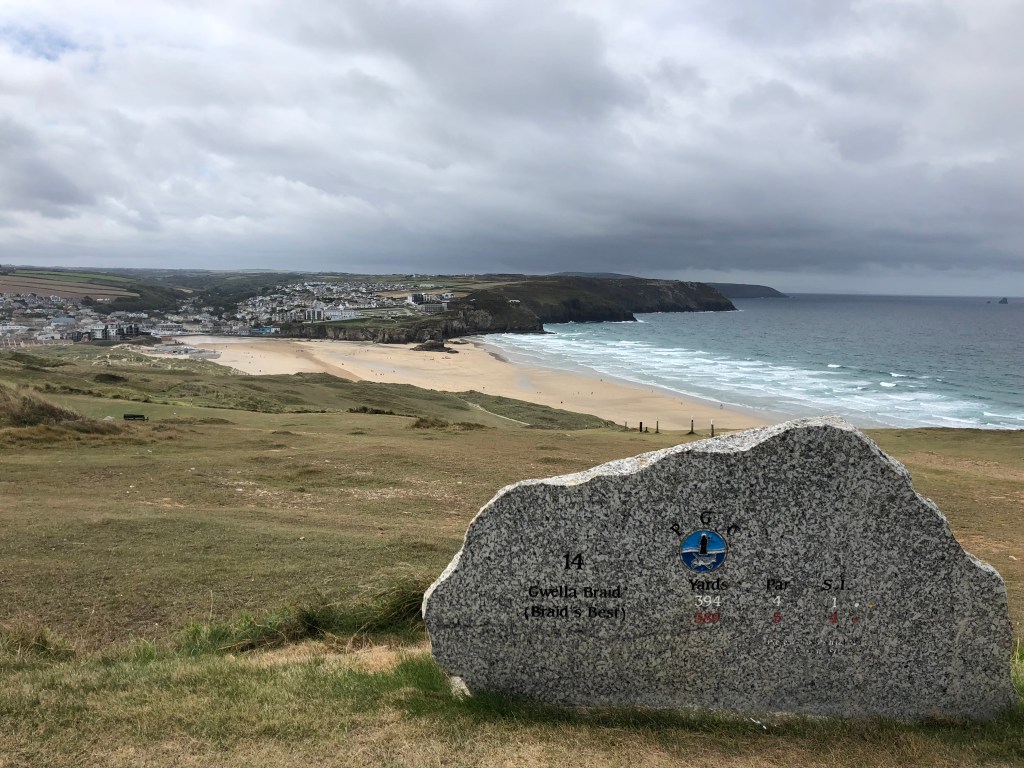 Those up ahead have moved on but before you drive off, cast a glance to the west, across Ligger Bay, to the lonely vigil of Cow and Calf. It is a clear day so it must be fit for golf. Of course, it is rare that blustery wind or rain will ever prevent play at Perranporth: not as far as the course is concerned.